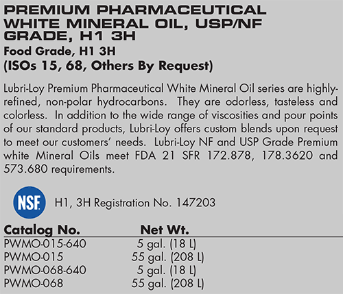 << Back to Products Air Line, Technical Grade White Oils Premium Air Line Lubricant, Mineral Premium Air Line Lubricant, Mineral, H1 Premium Air Line Lubricant, Synthetic, H1 Technical Grade White Mineral Oil, H1 Premium Pharmaceutical White Mineral Oil, H1 Premium Synthetic Seamer Fluid, H1